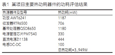 終端平臺的熱源器件主要有基帶芯片、射頻芯片、功放、電源管理芯片等,這些器件的功耗有的可以從廠商給的datasheet中查到,有的查不到,對于從datasheet中查不到功耗數(shù)據(jù)的熱源器件,需要根據(jù)經(jīng)驗或同類項目的測試數(shù)據(jù)進行估算,還可以直接向平臺提供商索取相關(guān)數(shù)據(jù)。表1為某項目主要熱功耗器件的功耗評估結(jié)果。