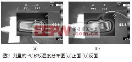 熱源器件的功耗分析、熱源器件的熱距離布局面積計算以及熱源器件的環(huán)境溫度分析都完成后就可以開始PCB的布局了,PCB的布局需要遵循最基本的熱設(shè)計原則,如:熱點分散;將最高功耗和發(fā)熱最大的器件布置在散熱最佳位置;不要將發(fā)熱較高的器件放置在印制板的角落和四周邊緣;高熱耗散器件在與基板連接時應盡能減少它們之間的熱阻等,另外還要按照上面計算的壓縮熱間距布放熱源器件,在熱源器件的壓縮熱間距內(nèi)盡量少布器件,更不能布放發(fā)熱器件,熱源器件的背面也要盡量少布器件,更不能布放發(fā)熱器件。圖1為本項目的最終PCB版圖,圖2為其溫度測量圖。由圖可見,本設(shè)計方法是實用的。