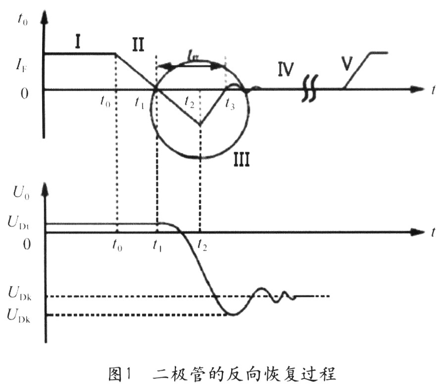 實(shí)際上已導(dǎo)通的二極管在突然加上反向電壓的一段時(shí)間內(nèi),電流下降到零以后,它并不立刻停止導(dǎo)通,還處于反向低阻狀態(tài)。此時(shí)在反向電壓作用下,載流子進(jìn)入復(fù)合過程,于是在反方向繼續(xù)流過電流;當(dāng)載流子復(fù)合完畢,反向電流才迅速衰減到零。這個(gè)階段就是二極管的反向恢復(fù)過程,如圖1所示。