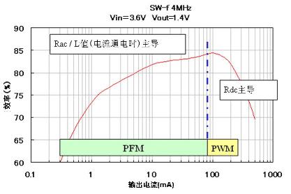 DC-DC轉換器的電源轉換效率和功率電感性能之間的關聯(lián)如圖3所示。PFM是指手機在待機狀態(tài)下保持低電流負荷的模式,這時電源轉換效率性能是與功率電感的Rac(交流電阻)以及電流-感值偏執(zhí)特性相關。圖4當中顯示了各功率電感的Rac特性以及圖5中開關頻率數是4MHz的DC-DC轉換器IC的電源轉換效率特性。