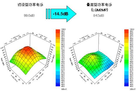 圖6顯示了繞線型功率電感和疊層型功率電感的磁束泄漏監(jiān)測數據。與一直以來作為DC-DC轉換器上使用的主要功率電感的繞線型功率電感相比,疊層型功率電感的磁束泄漏更少,現已證實閉合磁路的構造使磁束泄漏較少。這些數據表明在小型高速開關DC-DC轉換器電路中使用小型疊層型功率電感的情況下,能夠發(fā)揮它抗噪特性的特長。