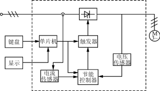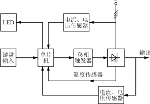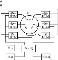 較為完整的ITPM一般由電力晶閘管,移相觸發(fā)器,軟件控制的單片機(jī),電流、電壓、溫度傳感器以及操作鍵盤(pán),LED或LCD顯示等部分組成。如圖1所示。