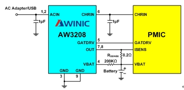 AW3206和AW3208的輸入引腳ACIN到地需要一個(gè)不小于1uF的輸入電容。這個(gè)輸入電容除了去耦外,還可以有效減小適配器在熱插拔時(shí)由于連接線的寄生電感效應(yīng)產(chǎn)生的瞬態(tài)過沖電壓。另外這個(gè)電容建議選取耐壓不低于15V的X7R或X5R陶瓷電容。