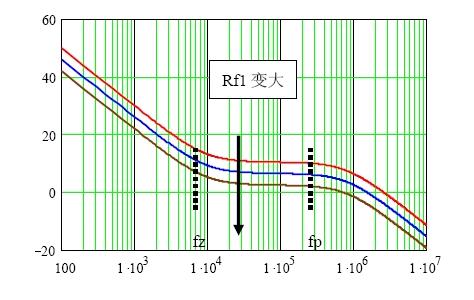因此,當(dāng)補(bǔ)償網(wǎng)絡(luò)進(jìn)入系統(tǒng)環(huán)路之后,Rf1的作用是使環(huán)路增益的幅頻特性上下平移,同時(shí)環(huán)路增益的相頻特性保持不變。