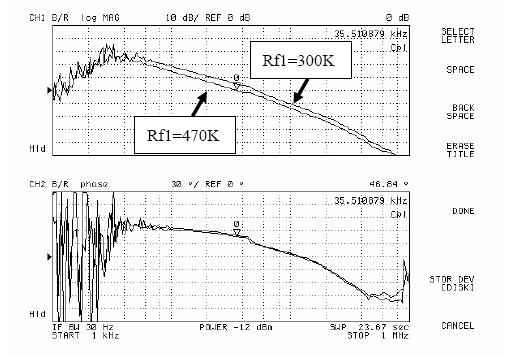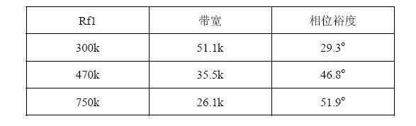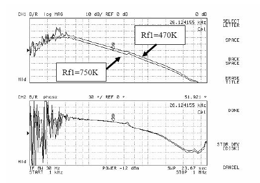 圖5和圖6是用網(wǎng)絡(luò)分析儀進(jìn)行AP3406環(huán)路增益測(cè)試的結(jié)果。由圖可以看出,當(dāng)Rf1從300k變化到470k,再變化到750k,系統(tǒng)的環(huán)路增益的幅頻特性不斷向下移動(dòng),同時(shí)相頻特性基本不變。于是系統(tǒng)的帶寬和相位裕度都有較大改變,測(cè)試結(jié)果如表1所示。