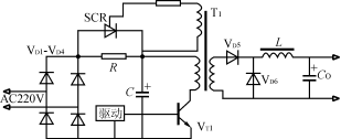 該電路如圖3所示。在電源瞬時(shí)接通時(shí),輸入電壓經(jīng)整流橋VD1VD4和限流電阻R對(duì)電容器C充電。當(dāng)電容器C充電到約80%的額定電壓時(shí),逆變器正常工作,經(jīng)主變壓器輔助繞組產(chǎn)生晶閘管的觸發(fā)信號(hào),使晶閘管導(dǎo)通并短路限流電阻R,開(kāi)關(guān)電源處于正常運(yùn)行狀態(tài)。