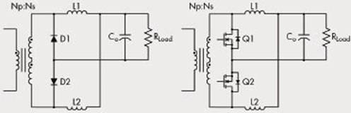 從拓?fù)涞慕嵌葋砜?,同步整流器的傳?dǎo)損耗和開關(guān)損耗都更低,能夠提高這些轉(zhuǎn)換級的效率,因而是開關(guān)模式電源次級端的基本構(gòu)建模塊,在服務(wù)器電源或電信整流器等低壓及大電流應(yīng)用中非常流行。如圖1所示,它取代了肖特基整流器,可使電壓降變得更小。從器件角度來看,過去十年中,功率MOSFET晶體管的進(jìn)展巨大,催生出了新穎的拓?fù)浜透吖β拭芏入娫础?0世紀(jì)早期平面技術(shù)問世之后,中低電壓MOSFET迅速被開發(fā)出來,利用溝槽柵技術(shù)來大幅提高性能。溝槽柵MOSFET是中低電壓電源應(yīng)用的首選功率器件,其把一個柵極結(jié)構(gòu)嵌入到精心蝕刻在器件結(jié)構(gòu)上的溝槽區(qū)域中。這種新技術(shù)可以提高溝槽密度,并無需JFET阻抗元件,因此能夠使特征導(dǎo)通阻抗降低30%左右。當(dāng)MOSFET的導(dǎo)通阻抗與漏極電流的乘積小于二極管正向電壓降時,同步整流的能量損耗降低。