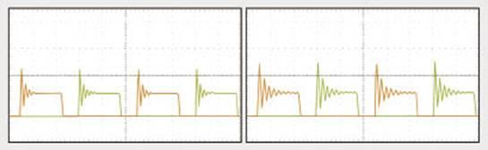 把有害電壓尖刺降至最小的一般原則是采用短而厚的電路板以及最小的電流回路。然而,由于尺寸和成本的限制,做到這些并不容易。有時,設(shè)計人員必需考慮到機械結(jié)構(gòu)的問題,如散熱器和風(fēng)扇;有時鑒于成本限制因素,不得不使用單面印制電路板。緩沖電路可作為一種可行的替代方案,用來在最大額定漏源電壓范圍內(nèi)管理電壓尖刺。這種情況下,額外的功耗是無法避免的。此外,輕載下緩沖電路本身產(chǎn)生的功耗也不可忽視。除了電路板參數(shù)之外,器件的特性也對電壓尖刺電平有影響。在同步整流中,一個主要的器件相關(guān)參數(shù)是反向恢復(fù)期間的體二極管軟度因子(softness)。基本上,二極管的反向恢復(fù)特性是由設(shè)計決定的。有好幾個控制輸入對反向恢復(fù)產(chǎn)生影響,如結(jié)溫、di/dt和正向電流水平。但是,當(dāng)條件固定時,二極管總是表現(xiàn)出相同的行為。因此,器件的評估結(jié)果對評測系統(tǒng)的運作情況非常有用。圖10所示為兩個不同器件(但有極其相似的額定值)的反向恢復(fù)波形。