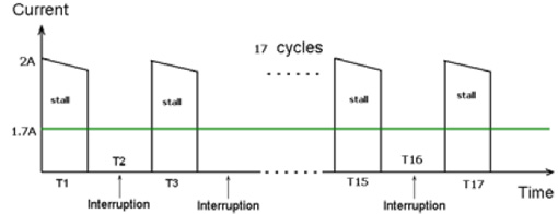 圖6為多功能豆?jié){機(jī)的堵轉(zhuǎn)電流。在榨水果的堵轉(zhuǎn)情況下,實(shí)測馬達(dá)的堵轉(zhuǎn)最大電流為2A,由于榨果汁時馬達(dá)也不是一直連續(xù)工作的,也是間隔一定時間工作,間隔時間是馬達(dá)工作6S,停3S,這樣換算成在一個榨水果完整工作周期內(nèi)平均電流是1.6~1.7A。在1.6~1.7A堵轉(zhuǎn)電流下,馬達(dá)堵轉(zhuǎn)需要保護(hù)的時間要求在150S內(nèi)。