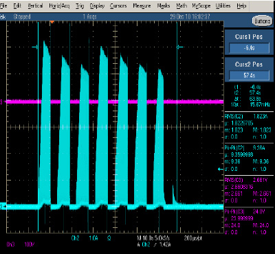 可見LVR100的典型值組件在0C/25C溫度下馬達(dá)保護(hù)時間還會更快,完全滿足小于150S的馬達(dá)保護(hù)要求。圖7為在25度下馬達(dá)堵轉(zhuǎn)保護(hù)的實(shí)測波形。