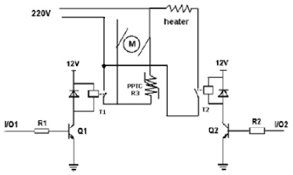 下圖3為多功能豆?jié){機(jī)馬達(dá)和加熱器的簡單電路示意圖。豆?jié){機(jī)所用馬達(dá)為220V直流馬達(dá),繼電器的工作電壓為12V,豆?jié){機(jī)利用繼電器把MCU發(fā)出的低壓控制信號I/O來控制交流高壓信號的通斷,R3為PPTC可恢復(fù)電阻,T1和T2為繼電器。