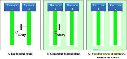 圖3. 雜散電容的路徑,顯示了下列并行走線的結果:無灌銅層的并行走線(A)、接地灌銅層上的并行走線(B),以及與走線具有相同直流電位的灌銅層上的并行走線(C)。