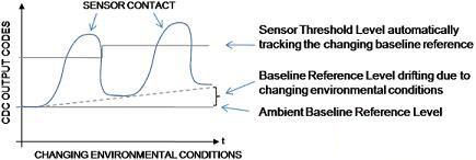 保持可靠性能。容性傳感器電極是采用PCB上的標準銅材料或柔性材料制成的。這種材料的特性會隨溫度和濕度的變化而發(fā)生改變。這種變化會使基線電平發(fā)生偏移(所有傳感器閾值電平均是以基線電平為參考的)。較大的基線偏移增加了接觸閾值電平過低或過高的風險(過低還是過高取決于基線偏移的方向)這會引起虛假的接觸誤差,或使閾值電平不是太靈敏就是不夠靈敏,導致接觸狀態(tài)的不穩(wěn)定。為保持傳感器原始的信號接觸閾值檢測電平余量(靈敏度),CDC需要自動跟蹤基線偏移誤差的幅度,并對閾值設置進行相應的重新調整。圖2中的示例介紹了AD7147和AD7148的閾值電平如何針對因環(huán)境條件變化引起的基線失調變化進行自動跟蹤和調整。