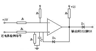 如圖1所示,過流保護信號取自CT2,經分壓、濾波后加至電壓比較器的同相輸入端,如圖4所示。當同相輸入端過電流檢測信號比反相輸入端參考電平高時,比較器輸出高電平,使D2從原來的反向偏置狀態(tài)轉變?yōu)檎驅?并把同相端電位提升為高電平,使電壓比較器一直穩(wěn)定輸出高電平。同時,該過電流信號還送到SG3525的腳10。當SG3525的腳10為高電平時,其腳11及腳14上輸出的脈寬調制脈沖就會立即消失而成為零。
