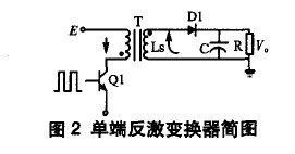 功率轉(zhuǎn)換部分采用單端反激電路,結(jié)構(gòu)如圖2。當(dāng)加到原邊主功率開關(guān)管Q1的激勵(lì)脈沖為高電平使Q1導(dǎo)通時(shí),直流輸入電壓加在原邊繞組兩端,由于此時(shí)副邊繞組相位是上負(fù)下正,整流管D1反向偏置截止,原邊電感儲(chǔ)存能量;當(dāng)激勵(lì)脈沖為低電平使Q1截止時(shí),原邊繞組兩端電壓極性反向,副邊繞組相位變?yōu)樯险仑?fù),整流管正向偏置導(dǎo)通,變壓器儲(chǔ)存的能量向副邊釋放。在此開關(guān)過程中,高頻變壓器既起變壓隔離作用,又起電感儲(chǔ)能作用。