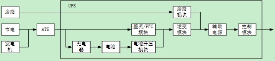 從單個UPS的設計來說,可以把整個產品按照模塊進行劃分,下面圖中是一個典型的UPS系統(tǒng)結構圖