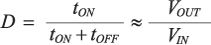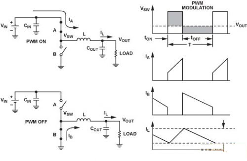 目前的低功耗同步降壓調(diào)節(jié)器以脈寬調(diào)制(PWM)為主要工作模式。PWM保持頻率不變,通過改變脈沖寬度(tON)來調(diào)整輸出電壓。輸送的平均功率與占空比D成正比,因此這是一種向負(fù)載提高功率的有效方式。