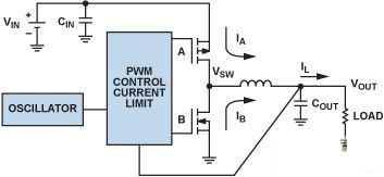 在圖 3 中,開關(guān) A 和開關(guān) B 分別利用 PFET 和 NFET 開關(guān)實(shí)現(xiàn),構(gòu)成一個同步降壓調(diào)節(jié)器。“同步”一詞表示將一個 FET 用作低端開關(guān)。用肖特基二極管代替低端開關(guān)的降壓調(diào)節(jié)器稱為“異步”(或非同步)型。處理低功率時,同步降壓調(diào)節(jié)器更有效,因?yàn)?FET 的壓降低于肖特基二極管。然而,當(dāng)電感電流達(dá)到 0 時,如果底部 FET 未釋放,同步轉(zhuǎn)換器的輕載效率會降低,而且額外的控制電路會提高 IC 的復(fù)雜性和成本。
