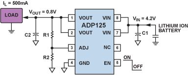 電池的續(xù)航時間是新型便攜式設(shè)備設(shè)計(jì)高度關(guān)注的一個特性。提高系統(tǒng)效率可以延長電池工作時間,降低更換或充電的頻度。例如,一個鋰離子充電電池可以使用ADP125 LDO以 0.8 V電壓驅(qū)動一個 500 mA負(fù)載,如圖 6 所示。該LDO的效率只有 19% (VOUT/VIN × 100% = 0.8/4.2 × 100%)。LDO無法存儲未使用的能量,因此剩余的 81%的功率(1.7 W)只能以熱量形式在LDO內(nèi)部耗散掉,這可能會導(dǎo)致手持式設(shè)備的溫度迅速上升。如果使用ADP2138 開關(guān)調(diào)節(jié)器,在 4.2 V輸入和 0.8 V輸出下,工作效率將是 82%,比前一方案的效率高出 4 倍多,便攜式設(shè)備的溫度升幅將大大減小。這些系統(tǒng)效率的大幅改善使得開關(guān)調(diào)節(jié)器大量運(yùn)用于便攜式設(shè)備。