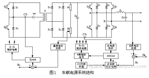 傳統(tǒng)車載電源一般采用逆變器加工頻變壓器的方案,它存在體積大、效率低等缺陷。隨著新型電力電子器件和電力電子技術(shù)的發(fā)展,采用高頻鏈的方案來實現(xiàn)無工頻變壓器的逆變電路,可以很好地解決傳統(tǒng)車載電源存在的問題,同時能保證車載電源的輸出電壓更穩(wěn)定、更平滑。