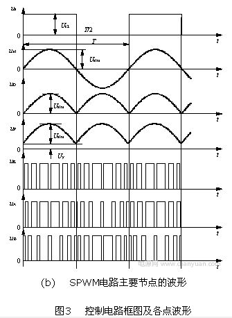 要得到正弦電壓的輸出,就要使逆變電路的控制信號以SPWM方式控制功率管的開關(guān),所得到的脈沖方波輸出再經(jīng)過濾波就可以得到正弦輸出電壓。通過SG3525來實現(xiàn)輸出正弦電壓,首先要得到SPWM的調(diào)制信號,而要得到SPWM調(diào)制信號,必須得有一個幅值在1~3.5V,按正弦規(guī)律變化的饅頭波,將它加到SG3525腳2,并與鋸齒波比較,就可得到正弦脈寬調(diào)制波實現(xiàn)SPWM的控制電路框圖如圖3(a)所示,實際電路各點的波形如圖3(b)所示。