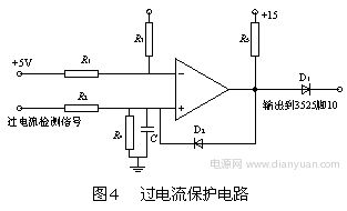 過電流保護采用電流互感器作為電流檢測元件,其具有足夠快的響應(yīng)速度,能夠在IGBT允許的過流時間內(nèi)將其關(guān)斷,起到保護作用。如圖1所示,過流保護信號取自CT2,經(jīng)分壓、濾波后加至電壓比較器的同相輸入端,如圖4所示。當(dāng)同相輸入端過電流檢測信號比反相輸入端參考電平高時,比較器輸出高電平,使D2從原來的反向偏置狀態(tài)轉(zhuǎn)變?yōu)檎驅(qū)?,并把同相端電位提升為高電平,使電壓比較器一直穩(wěn)定輸出高電平。同時,該過電流信號還送到SG3525的腳10。當(dāng)SG3525的腳10為高電平時,其腳11及腳14上輸出的脈寬調(diào)制脈沖就會立即消失而成為零。