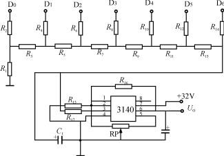 這需要將計(jì)數(shù)器的二進(jìn)制數(shù)轉(zhuǎn)化為電壓。顯然用D/A轉(zhuǎn)換是可以的,但電路復(fù)雜程度上升,成本也有所提高。故為了簡化電路我們僅借用D/A轉(zhuǎn)換網(wǎng)絡(luò)的思想,利用權(quán)電阻T形網(wǎng)絡(luò)將4516的7位數(shù)值變換成模擬量輸出,推動(dòng)電壓表指示,見圖5。