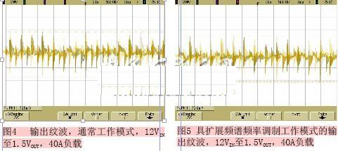 令人驚奇的是,對(duì)該系統(tǒng)進(jìn)一步的分析表明,在使用擴(kuò)展頻譜頻率調(diào)制時(shí),輸出紋波沒有受到非常大的影響。有和沒有擴(kuò)展頻譜頻率調(diào)制的性能比較如圖4和圖5所示。比較兩圖中的峰峰值,觀察到的變化是很小的。如果仍不信服,可進(jìn)行另一個(gè)測(cè)試-負(fù)載瞬態(tài)響應(yīng)測(cè)試,以進(jìn)一步確證。