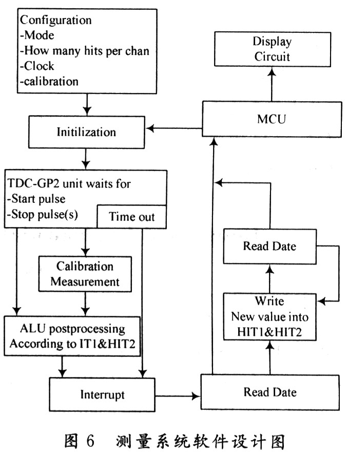 初始化之后,TDC-GP2高速測量單元接收到START脈沖后開始工作,達到設(shè)置的采樣數(shù)或者遇到測量溢出后才停止工作。軟件設(shè)計的重點在于根據(jù)需要設(shè)置TDC-GP2的工作模式和讀取其內(nèi)部的測量數(shù)據(jù)。在測量結(jié)尾,ALU開始依照HIT1和HIT2的設(shè)置處理數(shù)據(jù)并把結(jié)果送入輸出寄存器。如果不進行校準,ALU傳輸16位原始數(shù)據(jù)到輸出寄存器;如果進行校準,則ALU傳輸32位的固定浮點數(shù)到輸出寄存器。然后通過單片機AT89S52處理后,在液晶顯示器讀取時間間隔數(shù)據(jù),其測量流程如圖6所示。