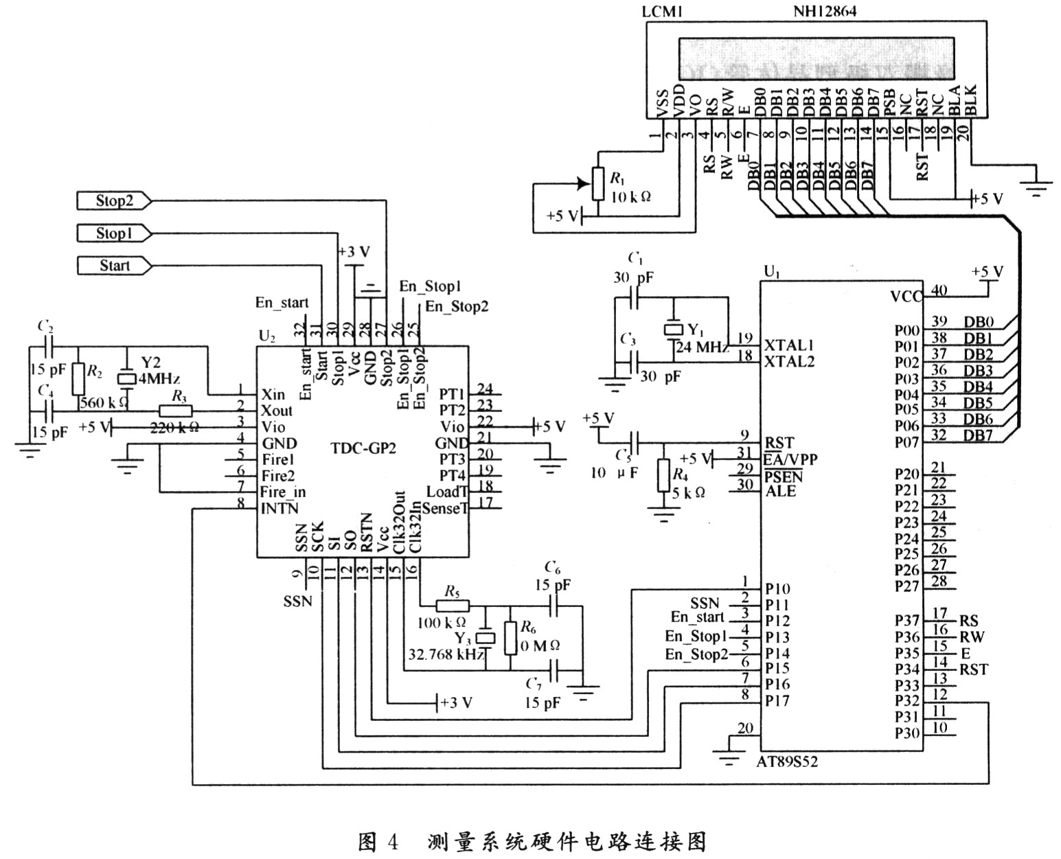 系統(tǒng)主要由脈沖信號取樣器、脈沖輸入信號整形電路、TDC-GP2測量電路、AT89S52單片機、液晶顯示電路、電源電路、時鐘電路組成。TDC-GP2的每個測量通道都提供一個使能引腳,可獨立地設(shè)置這兩個引腳進行通道選擇。TDC-GP2需要一個2~8 MHz的高速時鐘進行校準用。TDC-GP2只是在進行時間測量時才必須用振蕩器,且能夠自動控制振蕩器的開啟時間。整個系統(tǒng)的硬件電路連接如圖4所示。
