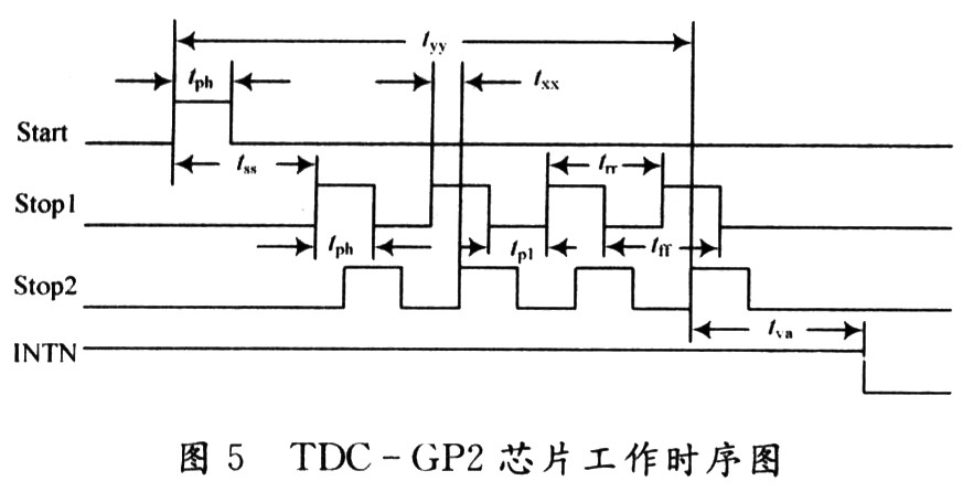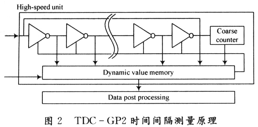 該系統(tǒng)主要由脈沖產(chǎn)生器、數(shù)據(jù)處理單元、時間數(shù)字轉(zhuǎn)換器、溫度測量單元、時鐘控制單元、配置寄存器以及與單片機相接的SPI接口組成。在實際應(yīng)用中,由于TDC-GP2的功耗很低,使得TDC-GP2的輸入/輸出電壓(工作電壓)為1.8~5.5 V,核心電壓為1.8~3.6 V,所以可以采用電池供電,使用方便。同時單片機由4線的SPI接口相連,可以把TDC-GP2作為單片機的一個外圍設(shè)備來操作。通過內(nèi)部ALU單元計算出時間間隔,并將結(jié)果送入結(jié)果寄存器保存起來。通過對TDC-GP2內(nèi)部寄存器的設(shè)置,可以多次采樣并將結(jié)果保存。TDC-GP2是基于內(nèi)部的模擬電路測量“傳輸延時”來進行的,是以信號通過內(nèi)部門電路的傳播延遲來進行高精度時間間隔測量的。TDC-GP2時間間隔測量原理如圖2所示。