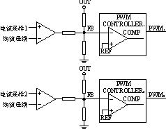 通過檢測RC網(wǎng)絡(luò)中C兩端的電壓,作為電流信號,幾路電流信號(本例只有兩路)通過一個相同的電阻就得到了平均值均流母線,平均值均流母線電壓值與負載有關(guān),表征負載電流的大小。然后將每路采樣來的電流信號與母線電壓比較,得到誤差信號,去修正輸出電壓參考信號,從而對PWM控制器的占空比輸出進行微調(diào),達到均流和穩(wěn)壓的目的。