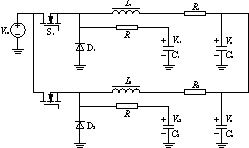 式中:Vc1、Vc2分別為C1和C2上電壓的平均值;IL1、IL2分別是L-和L2流過電流的平均值,亦即兩路輸出電流平均值;R1及R2是濾波電感的等效串聯(lián)電阻,當(dāng)在工藝上設(shè)計并聯(lián)電源每路輸出電感基本上一樣時,可以認為R1=R2。因此,要控制兩路電流均流,即要求IL1=IL2,于是,只要控制Vc1=Vc2就行了。所以,電容C1及C2上的電壓Vc1和Vc2可以代表兩路電流IL1及IL2大小,可用來進行均流控制。