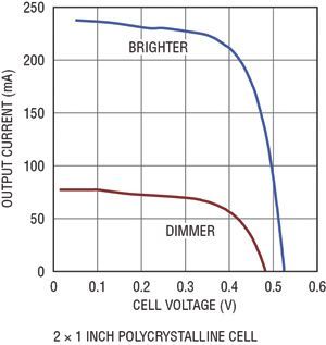 相比之下,靠室內(nèi)照明光工作的設(shè)備可用能量要少得多。常見的室內(nèi)照明光的強(qiáng)度約為充足太陽(yáng)光的0.25%(室內(nèi)照明光強(qiáng)度與太陽(yáng)光強(qiáng)度的巨大差別難以察覺,因?yàn)槿搜勰苓m應(yīng)很寬的光照強(qiáng)度范圍)。室內(nèi)應(yīng)用可用的光照量低得多,因此呈現(xiàn)了一些設(shè)計(jì)上的挑戰(zhàn)。即使面積為4平方英寸的大型高效率晶體電池,在典型辦公室照明條件下,也僅能產(chǎn)生860μW功率。