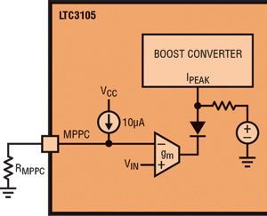 圖4顯示了LTC3105 使用的最大功率點(diǎn)控制機(jī)制的模型。圖3顯示了光伏電池的功率曲線。請(qǐng)注意,當(dāng)電池電壓上升而離開峰值功率點(diǎn)時(shí),光伏電池的功率就會(huì)從峰值點(diǎn)急劇下降。因此,一般更希望低于理想值而不是高于理想值的控制電壓,因?yàn)楣β是€在高壓端下降得更快。