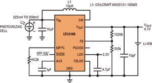 串聯(lián)連接的高壓光伏電池組能提供充足的功率,但單節(jié)光伏電池解決方案卻很少見,因?yàn)閱喂?jié)光伏電池在有負(fù)載情況下產(chǎn)生的電壓很低,從這么低的電壓難以產(chǎn)生有用的電源軌。幾乎沒有升壓型轉(zhuǎn)換器能從電壓很低、阻抗相對(duì)較高的單節(jié)光伏電池產(chǎn)生輸出。不過,LTC3105是專門為應(yīng)對(duì)這類挑戰(zhàn)而設(shè)計(jì)。該器件具有超低的250mV啟動(dòng)電壓和可編程最大功率點(diǎn)控制,能從富有挑戰(zhàn)性的光伏電源產(chǎn)生大多數(shù)應(yīng)用所需的典型電壓軌(1.8~5V)。