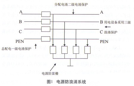 智能儀表控制系統(tǒng)的電源是從配電系統(tǒng)進入計算機主控室。電源系統(tǒng)是從發(fā)電廠通過變壓器、配電系統(tǒng)最后供儀表系統(tǒng)使用,在雷暴天氣中電源輸送進由于環(huán)韋多途徑長,極可能遭受雷擊,因此此時的電源并不是380v或220v、50Hz交流電,而是參雜了各種雜波的浪涌電壓,如果不設(shè)置防浪涌保護系統(tǒng),那么使用中的電器設(shè)備會因超過耐壓極限而發(fā)生事故。將總配電進來的A、B、C、D三線四相并接至電源浪涌器所相對的A、B、C、D接線柱上。在雷暴時感應(yīng)雷浪涌通過電涌保護器保護將過載電流匯入大地,輸出電壓鉗制在安全工作區(qū)內(nèi),確保電源安全運行。電源防浪涌系統(tǒng)如圖1所示。