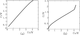 根據(jù)所設(shè)計的檢測電路進(jìn)行實驗,實驗時,調(diào)節(jié)輸入電壓Ui的大小,并檢測與之對應(yīng)的輸出電壓UO的大小,實驗結(jié)果如表1(a)所示。為了進(jìn)行對比,同時測出沒有反饋的光耦的輸入與輸出電壓關(guān)系,并列在表1(b)。根據(jù)表1中(a)、(b)的數(shù)據(jù)分別繪出檢測電路與單個光耦的傳輸特性,分別如圖3(a)、(b)所示。