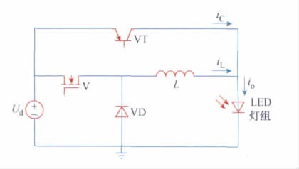 電路如圖1 所示。電路結(jié)構(gòu)以BUCK電路為主,取消電解電容濾波,用輔助線性電路對(duì)電感紋波電流進(jìn)行補(bǔ)償。圖中由開關(guān)管V、電感L、LED 燈組、續(xù)流二極管VD 組成主電路; 晶體管VT 為輔助補(bǔ)償電路。