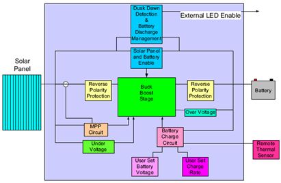 在白天時(shí)間系統(tǒng)對電池充電,而在夜間電池放電照亮定義的空間。雖然輸入能量不能保證,但輸出能量可在相當(dāng)長的時(shí)間保持不變。如果一個(gè)系統(tǒng)的大小不合適,電池可能因放電而損壞。要防止電池?fù)p壞,必須用LED電路抑制操作,防止電池耗盡。