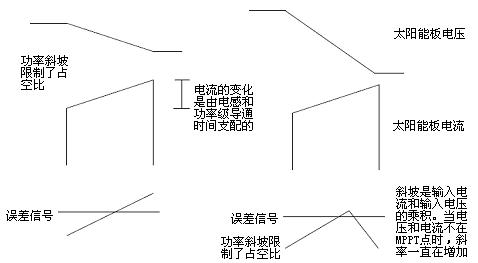 為了從功率可變的電源(即太陽能電池板)析取出最大的功率,太陽能控制器必須采用MPPT。MPPT必須首先找到最大功率點(diǎn)并及時(shí)調(diào)整環(huán)境條件,以保持控制器接近最大功率點(diǎn)。動態(tài)MPPT用在系統(tǒng)發(fā)生改變的情況下。由于每個(gè)開關(guān)周期都在發(fā)生變化,太陽能電池板汲取的功率也會在每個(gè)周期有明顯的改變。動態(tài)MPPT利用太陽能電池板的電壓驟降乘以每個(gè)開關(guān)周期增加的電流,以確定將要產(chǎn)生的誤差信號來調(diào)節(jié)占空比。動態(tài)響應(yīng)可檢測IV曲線的斜率,從而建立一個(gè)功率斜坡,從誤差信號相交點(diǎn)建立一個(gè)代表占空比的功率。當(dāng)斜坡變化斜率從正到負(fù)時(shí)該周期結(jié)束,如圖2所示。