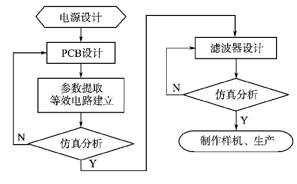 如果以上所有降低EMI的措施都完成了還沒有達(dá)到EMC的標(biāo)準(zhǔn),就可以根據(jù)前面仿真分析得到的差模和共模干擾的波形對(duì)濾波器進(jìn)行設(shè)計(jì)。在設(shè)計(jì)濾波器的時(shí)候,也同樣要注意元件的布局,還有PCB寄生參數(shù)對(duì)濾波器阻抗的影響,其本質(zhì)也是增大對(duì)干擾的阻抗,使干擾無法通過傳播路徑。開關(guān)電源設(shè)計(jì)流程如圖5所示。