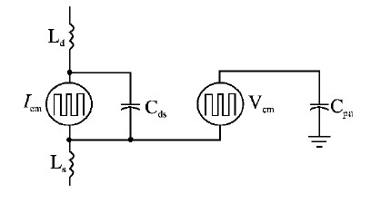 由于需要分別對(duì)DM 噪聲和CM 噪聲進(jìn)行分析,所以對(duì)DM 噪聲源和CM 噪聲源也需要分別建模。M.Nave提出使用電流源作為DM 噪聲源,使用電壓源作為CM 噪聲源的方法,就是因?yàn)镈M 噪聲主要由di/dt引起,而CM 噪聲則主要由dv/dt引起。在此基礎(chǔ)上對(duì)CM 噪聲源進(jìn)行改進(jìn),考慮了電壓過沖和下沖,并且在線路阻抗近似平衡的情況下,利用DM 電流源和一個(gè)電壓源來表示CM 噪聲源(如圖2所示)。