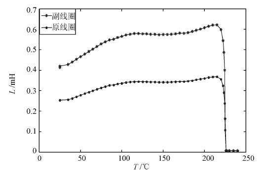 變壓器在中不僅能傳遞能量,同時還起到了電氣隔離的作用,變壓器的原邊與副邊線圈匝數比的不同可以達到升壓或降壓的作用。在模塊工作狀態(tài)下,由于磁芯的渦流效應,變壓器會產生很多的熱量,成為模塊熱量產生的主要來源。實驗中首先測試了變壓器原邊和副邊線圈的電感量隨溫度的變化,如圖3 所示,從圖3 中可見隨著溫度的升高,線圈的電感量先增加,然后小幅下降,再小幅上升,在環(huán)境溫度為220℃ 以前,變壓器的原邊與副本電感量的整體趨勢是逐漸增加,當溫度達到220℃,磁芯溫度達到居里點,線圈的電感量迅速降為零。對于不同磁芯材料的變壓器其居里點溫度有所不同,對于此類變壓器,可知居里溫度在220℃附近。當變壓器溫度接近居里點時,變壓器電感量會迅速減小,會導致輸出電壓迅速下降。