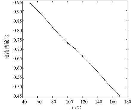 在本實驗中,首先測試模塊中使用的光耦NEC2705 的輸入端電流與輸出端電流的比例系數隨溫度的變化,輸入端所加電流為11 mA,結果表明在25 時,該光耦的電流傳輸比接近1:1, 但是隨著溫度的升高,輸入電流不變,輸出端的電流逐漸減小,大約每升高10,光耦的電流傳輸比減小4%,結果如圖4 所示。