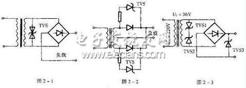 圖2-3所示電路中,單向TVS1和TVS2反接并聯(lián)于電源變壓器輸出端或選用一個(gè)雙向TVS,用以保護(hù)整流電路及負(fù)載中的元器件。