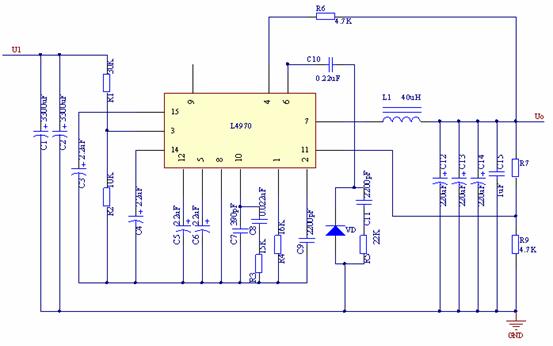 L4970A芯片的輸出電壓設(shè)定為10.8V,其輸出電阻R7由下式確定:,其中R9=4.7K,令Uo=10.8V,則R7=5.25K,取標(biāo)稱(chēng)值5.1K。