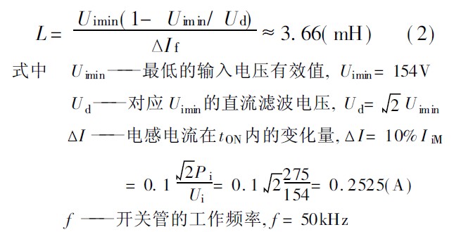 我們設(shè)計開關(guān)管的工作頻率為50kHz, Rt= 11. 2kΩ , C t= 2. 2nF, 輸入電壓Ui 范圍為220V+ 20%- 30%, 直流電壓Ud = √2Ui, DC/ DC 的輸出功率為250W, 輸入功率為275W, 效率η=91%, 根據(jù)公式計算校正電感: