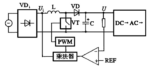 高頻有源PFC 是根據(jù)電網(wǎng)的電壓、電流及負載的變化產(chǎn)生PWM 信號, 控制高頻電子開關(guān)導(dǎo)通的, 可起調(diào)節(jié)電感L 的作用。改善電流波形, 利用乘法器控制PWM 信號, 可使電網(wǎng)的輸入電流基本為正弦波, 使λ接近于1( 即大于0. 99) 。圖1 示出PFC 的原理框圖。