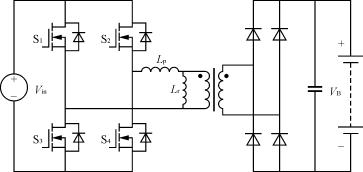 與充電模式2類似,充電變換器可以直接采用全橋或帶諧振的全橋變換器。但是,由于充電模式3功率級更高,與諧振式全橋變換器相比,一般的全橋變換器必然會對應(yīng)很高的峰值電流。因此,應(yīng)當(dāng)考慮采用ZVS或ZCS諧振全橋拓?fù)鋪碛行Ы档蛽p耗。